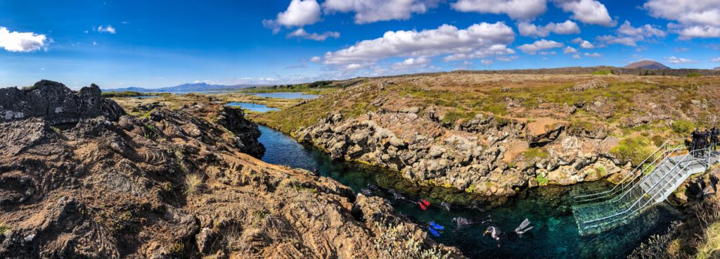 Ein kurzer Stop bei der Silfra-Spalte ließ uns Taucher beobachten, die in dem glasklarem Wasser zwischen der Nordamerikanischen und der Eurasischen Platte schwammen.