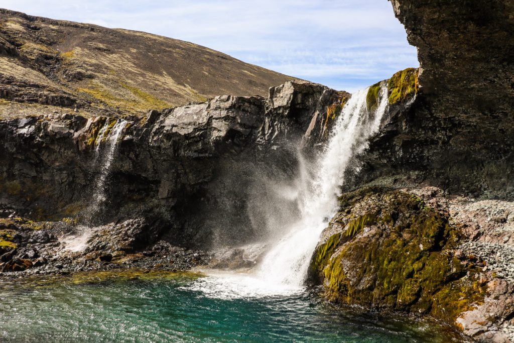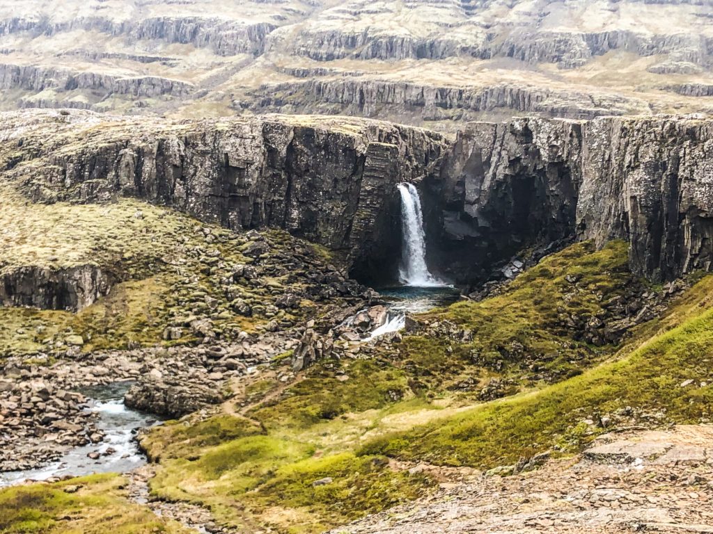 Weiter ging es zu einem Wasserfall, den man bei der unscheinbaren Gegend ohne einen Tipp gar nicht bemerkt hätte.. Sein Name ist Skutafoss.