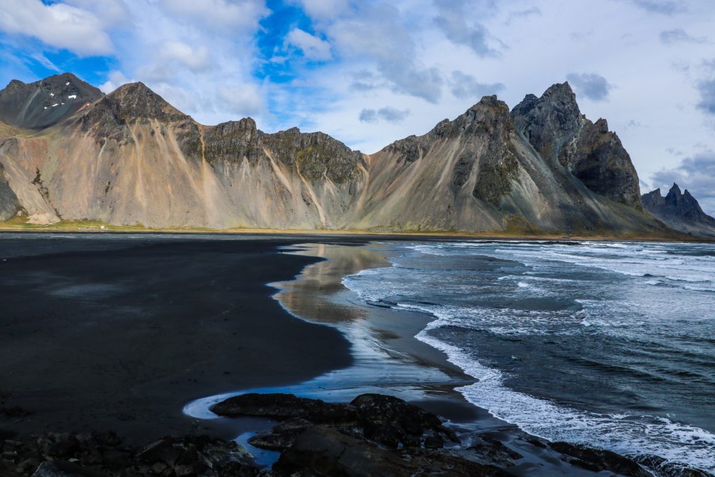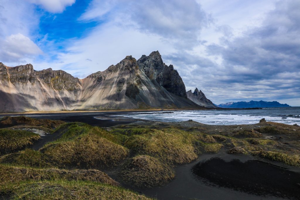 Also setzten wir uns wieder ins Auto und fuhren zu einer Landzunge im Südosten. Wir besuchten ein Wikingerdorf, welches extra zu Drehzwecken gebaut worden war. Und das direkt am Strand vor dem Vesturhorn. Anschließend wechselten wir nochmal den Standort, damit man den Berg noch aus einer anderen Perspektive fotografieren konnten. Entscheidet selbst, ob sich das gelohnt hat. Wir finden schon.