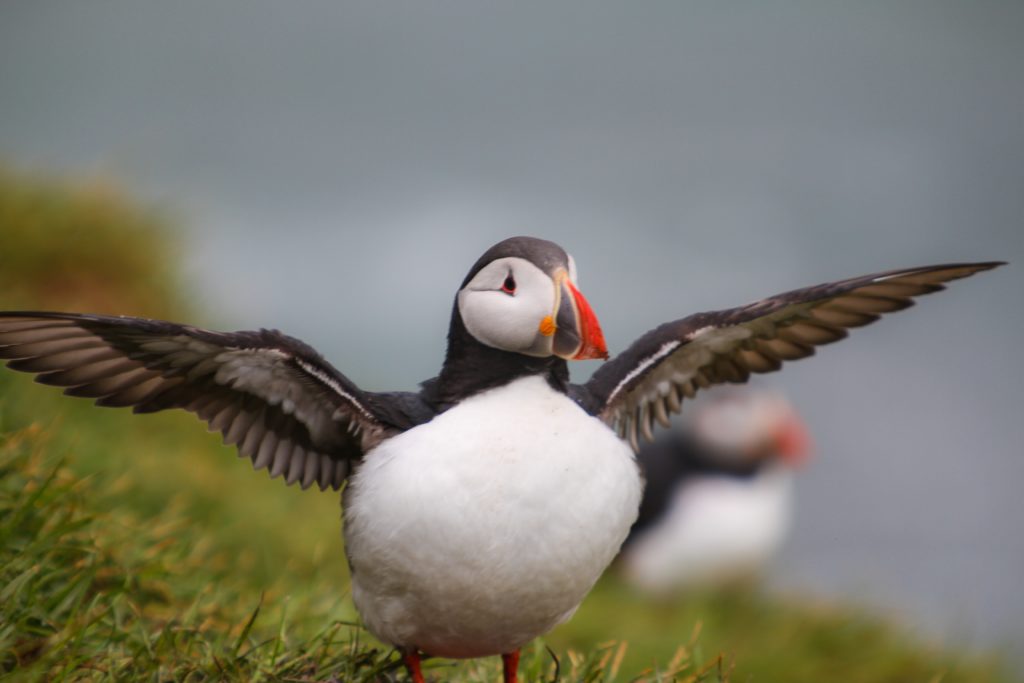Aber dann ging es auch irgendwann wieder bergab und der Schnee nahm ab und der Regen wurde stärker. Puh, das wäre geschafft. Dann kamen wir endlich in dem Ort an und siehe da, dort gab es eine Informationstafel, die uns mitteilte an welchem Ort man diese süßen Vögelchen am ehesten sehen konnte. Auf dem Parkplatz stellten wir unser Auto ab, zogen gefühlt alle Mützen, Regenjacken und Kapuzen an, die wir zur Verfügung hatten und liefen durch den Regen zu dem Felsen. Und hunderte Papageientaucher warteten sehnsüchtig auf uns. Der Tag war gerettet, wen interessierte der Sturm und der Regen. Alles war einfach wunderbar.